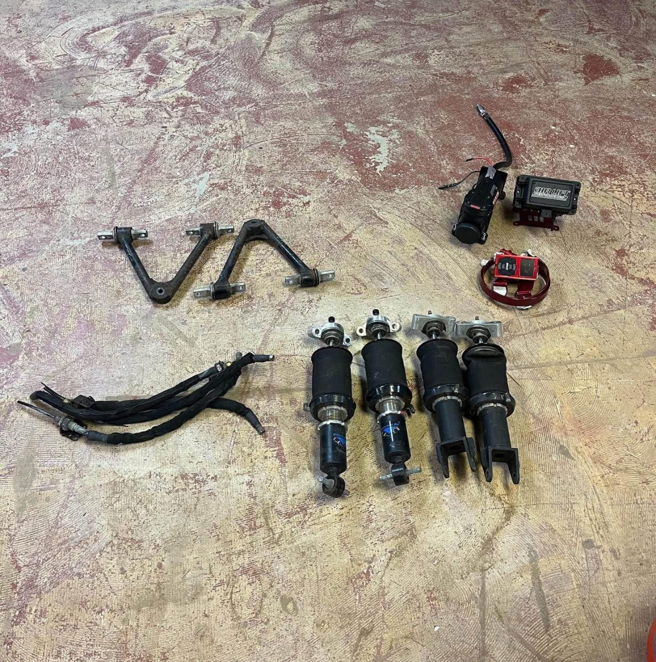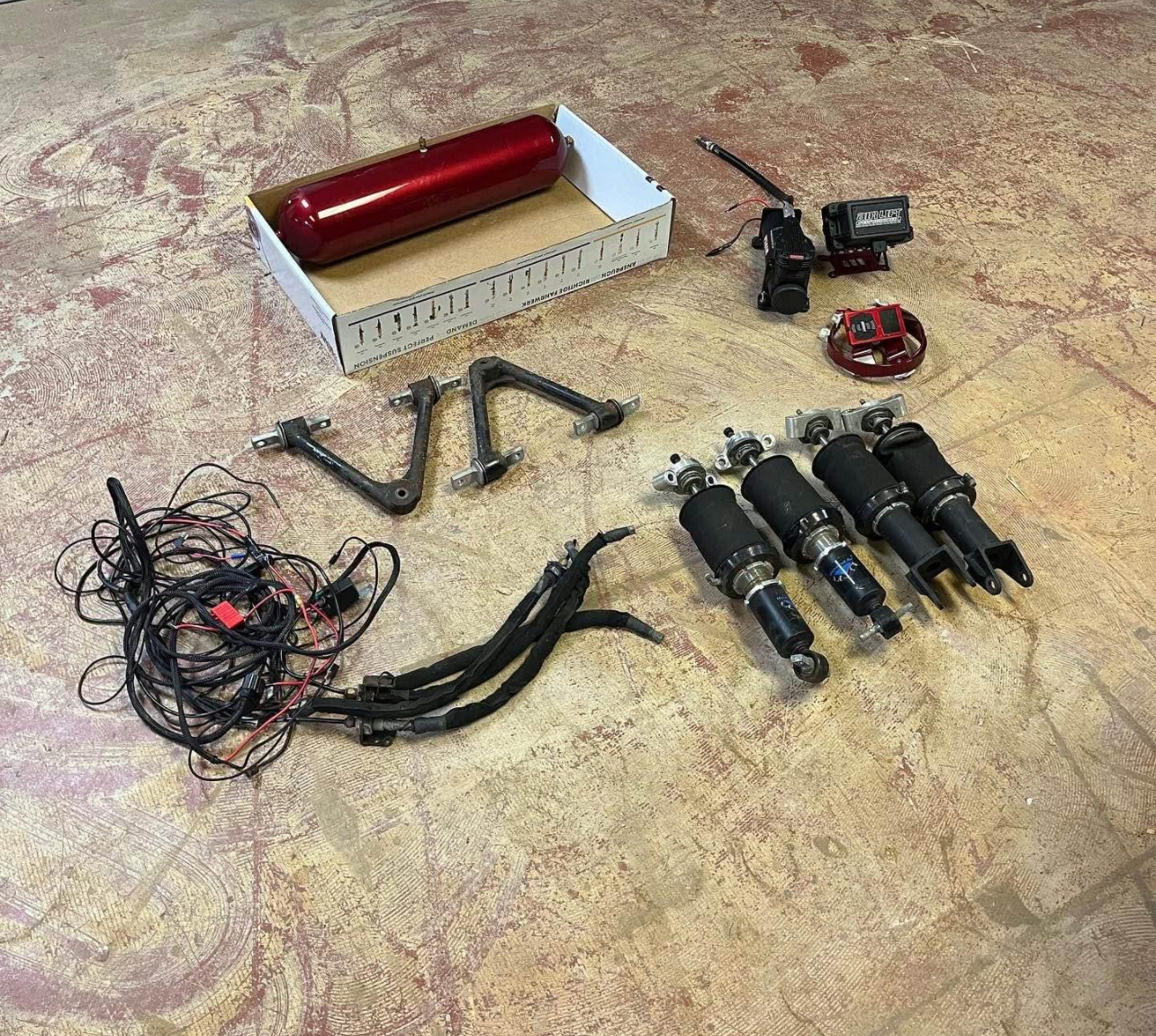 Selling air ride that fits any c7 corvette 2014-2019. This kit works for any c7 (stingray, grandsport, zo6 z51 or none z51 package) the struts are from universal air, and the Managment system is 3p from airlift performance. This is a sleeved coil, so the shocks have hardening and softening and can have the height adjusted (with or with out using the air lift) to dial in the perfect ride and not lose any of the performance aspects of the car. upper control arms on the front are replaced with this custom manufactured set from itl garage. The kit requires the removal of leaf springs (typically for any lowering kit of a c7). This is a turn key kit including compressor, tank, airlift management remote, mounts for everything and wiring Harness. The lower mounts on the rear shocks were beefed up from universal air to handle more power. The kit only has about 10k miles on it.