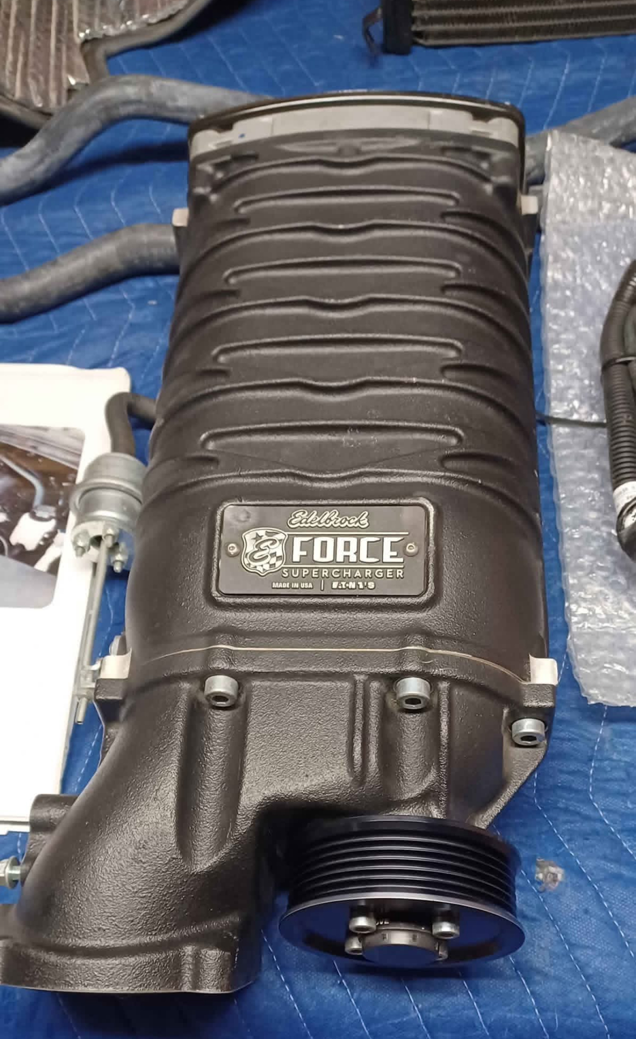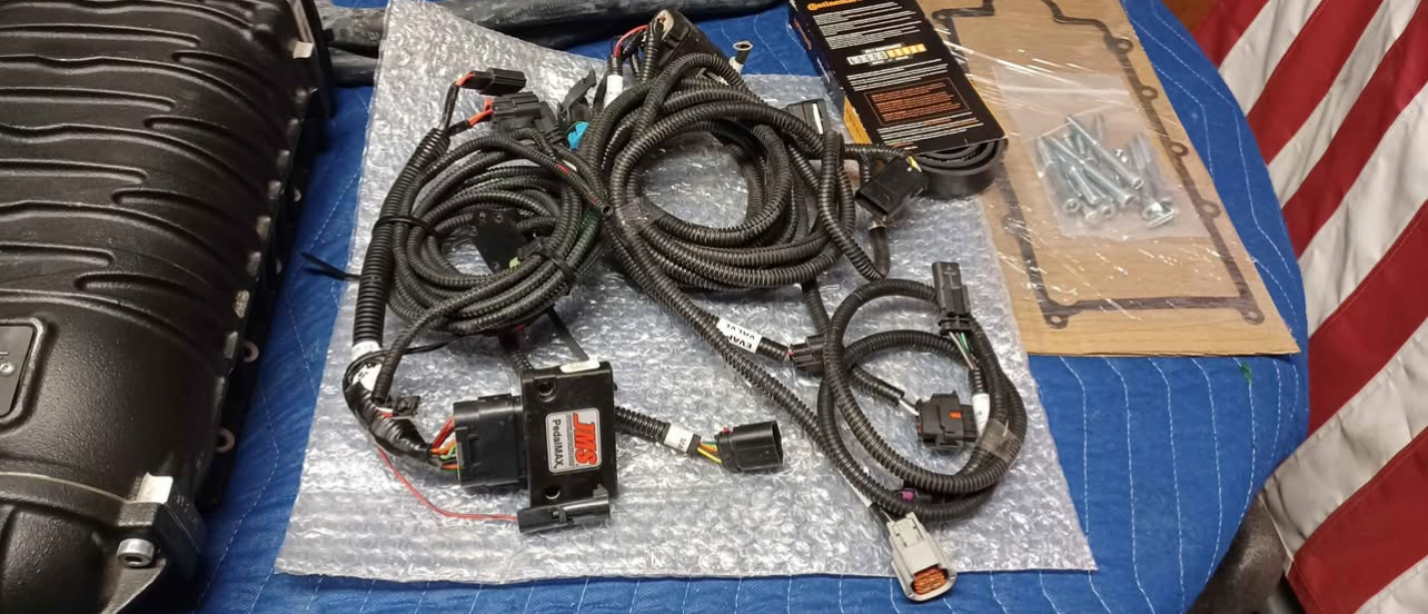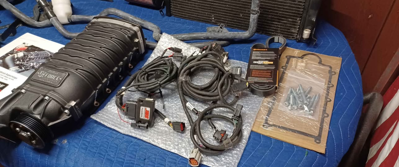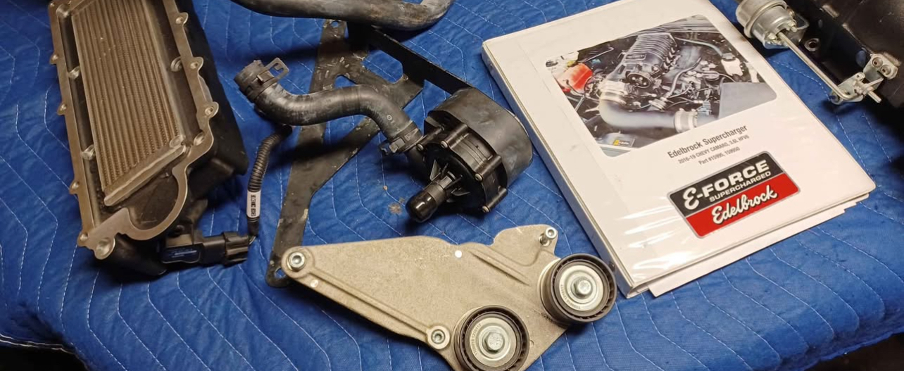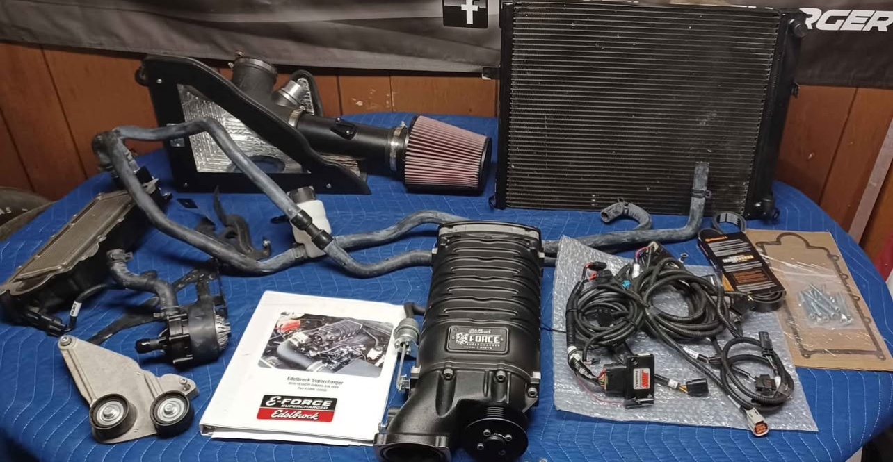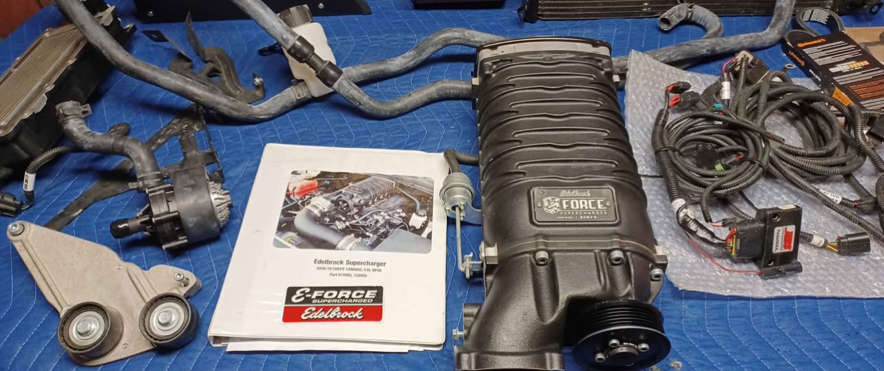 Selling a 2016-2023 Camaro 3.6 V6 Edelbrock E-Force Supercharger Kit Europe. This includes everything shown. This kit has also been upgraded with a Cold Air Inductions air intake kit and a JMS Pedalmax system. The supercharger kit is complete minus a small bracket that holds a wire harness in place and the tune. You can either order that bracket from Edelbrock rather inexpensively or simply use a ziptie or two in it’s place. The tuner can also be purchased through Edelbrock or you can purchase your own tuner from one of the numerous performance retailers out there or get a custom dyno tune following installation. This is a very low mileage kit with only 5K miles tops. The supercharger is in perfect working order!! There are some bent fins on the heat exchanger but only cosmetic and not seen when installed. With the air intake upgrade and JMS pedalmax kit.